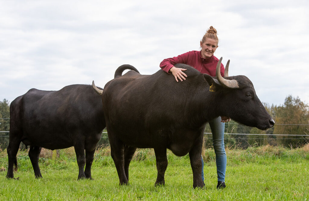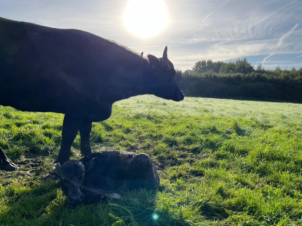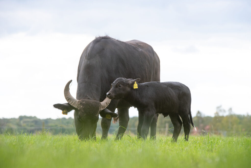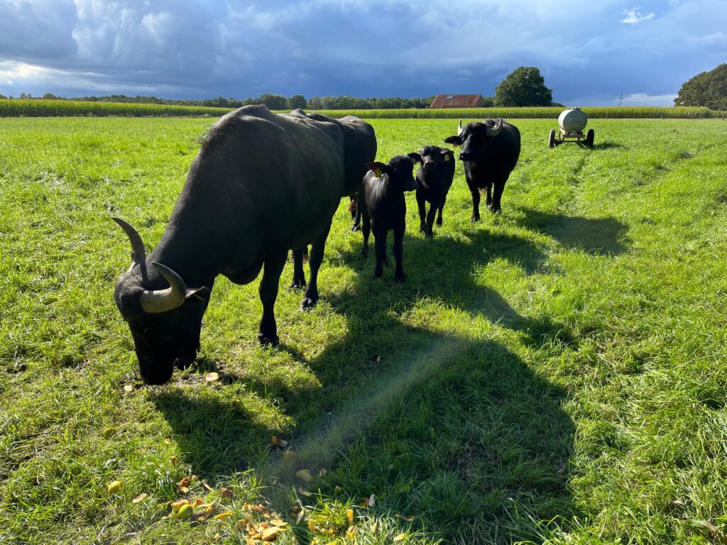 So kamen im Februar 2016 unsere ersten beiden Wasserbüffel auf den Hof. Noch im selben Jahr, im November, wurde unser erstes Kalb geboren – ein Moment, den wir nie vergessen werden. Inzwischen haben wir über 25 eigene Kälber aufgezogen und unsere Herde ist stetig gewachsen.